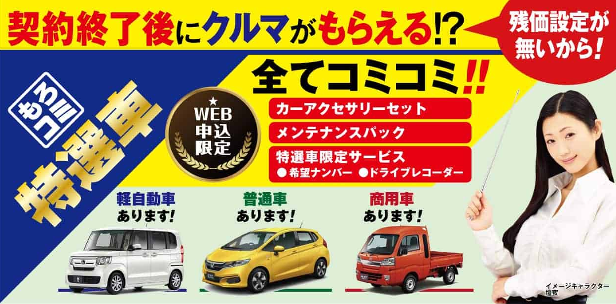 車検(基本工賃)・税金・新車登録費用などコミコミで月々お支払いが一定額で新車に乗れる。